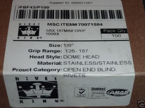Box of 100 Rivet Kings FBF46 Stainless Steel Open End Blind Rivets 1/8" x .525
