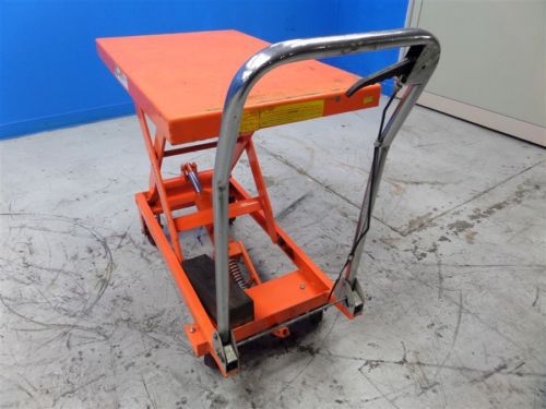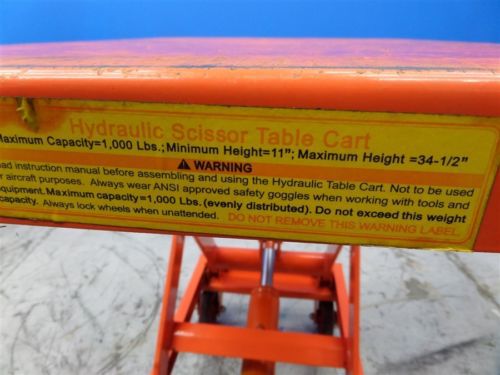 Call Us Today! 626.330.4647|info@1machinerysales.com 1000 LB CAPACITY PORTABLE HYDRAULIC SCISSOR LIFT TABLE CART 31-3/4" x 19.5" 1000 LB CAPACITY TABLE TOP: 31-3/4" x 19.5" PLEASE NOTE: CURRENTLY DOES NOT STAY ALL THE WAY UP. MAY NEED HYDRAULIC FLUID. SOLD AS IS 11" MIN HEIGHT 34.5" MAX HEIGHT MEASURES: 39" x 20" x 39" WEIGHT: 83 LBS NEEDS NEW RELEASE CABLE Copyright 2014 1 Machinery Sales.com | All Rights Reserved Policies DESCRIPTIONS Please read descriptions carefully, we list any features, specifications and details we know and/or research. If you don’t see the information you need or notice any discrepancy; Contact Us! We are here to answer all your questions regarding our eBay Listings and our eBay Store. All items come as shown in pictures. PAYMENTS We accept Visa, MasterCard and Discover via PayPal. Payments are expected within 3 days after the close of the auction. An eBay Non-Paying Bidder Notification will be filed if payment has not been received. After 10 business days of non-payment item will be relisted and no payment from previous transaction will be accepted. Sales Tax is calculated on the final auction cost plus shipping charges and must be paid prior to shipment. STORAGE We offer storage services from small items to full containers. We also offer container loading, Contact us for prices. For buyers bidding on, or buying multiple items, we will hold them for up to 7 days at no charge, after 7 days fees may apply. Contact us when you are planning to bid on multiple items across multiple days. FEEDBACK Positive feedback will be left after payment has been received. If after receiving your item, you have concerns, questions or the item is not what you expected please Contact Us! We want to make your transaction a pleasant experience. Don’t leave Negative or Neutral feedback before doing it. We are professionals and we are here to help you. RETURNS We accept returns for all our items listed as working. Items listed in “AS IS” condition or “For Parts or Repair” have no warranty, read our descriptions carefully. We give 14 days to Contact Us and return the item. Refund can be process in the form of exchange, merchandise, store credit or money back. Buyer is responsible to ship the item back to us; we will be responsible to ship the exchange back. SHIPPING For combined shipping items should meet the following criteria: Combined items should fit in any of the flat Rate Boxes offered by USPS. All items must be paid at same time for the same invoice. All items should be shipped to the same address. Carriers: USPS flat Rate, FedEx Ground & UPS Ground. For International: USPS Priority Intl. Please note UPS & Fedex charge extra for residential delivery. Please call us before 1PM PST if you need expedited services *Additional cost will apply* HANDLING FEES Fees will apply as follow: Weight Charges 1 to 6 lbs. $ 3.50 7 to 20 lbs. $ 4.50 21 to 35 lbs. $ 7.00 36 to 80 lbs. $ 9.00 Handling fees are subject to change if item(s) are oversized. LOCAL PICK UP Please call to schedule a time & day for pick up. When picking up have your paperwork ready (eBay Invoice and eBay ID) and a valid ID ready. For inspection please call ahead. We are located at: 14911 Don Julian Rd. City of Injdustry, California, 91746 Phone number 626.330.4647 Monday to Friday from 10:00 am to 2:00 pm, please wait in the front office a person will be asigned to you. Payment must be cleared before picking up your item. Please note that a $25.00 loading fee will apply if Forklift Services required. Unless stated in the listing above. FREIGHT Freight charges on the invoice will be from FedEx Freight. If you do not wish to use FedEx Freight services please contact us at info@1machinerysales.com. For Nevada, Arizona and California we use LA Machinery Moving, click here for an online quote or call us 626.330.4647 Items that require a standard 4’x4’ pallet will have a $25.00 fee. Please call for pricing on items that require custom skid or custom crating. We encourage our customers to arrange their own shipping on items that cannot be shipped through FedEx ground (items over 150 Lbs.) A $25.00 Loading fee will apply unless stated in the listing. If you're arranging your own freight please have a completed bill of lading to info@1machinerysales.com before sending a truck. ITEMS OVER $15,000.00 Prior to placing a bid of $15,000.00 or more buyer requires verification of payment status which could be credit card or any other alternative means. Click here for more information. CLAIMS In the event that your item gets damaged during shipment please following the steps below. Damaged packages. 1) Keep all original packing together as the carrier may require it to process the claim. 2) Take clear photos of the box & item showing the damage. 3) Send all photos to us via eBay messages & provide a short description on what is broken. Damaged pallets. If your shipment shows visible signs of damage, immediately ask the driver to inspect the contents with you. Then write a precise description of the damage on both your copy and the driver’s copy of the delivery receipt. 1) Keep all original packing together as the carrier may require it to process the claim. 2) Take clear photos of the pallet/item before offloading. 3) Send all photos to us via eBay messages & provide a short description on what is broken. Once all that information is received we will contact the carrier and submit a claim. *Freight claims only apply if 1MachinerySales arranged the freight* Click Here. Double your traffic. Get Vendio Gallery - Now FREE!