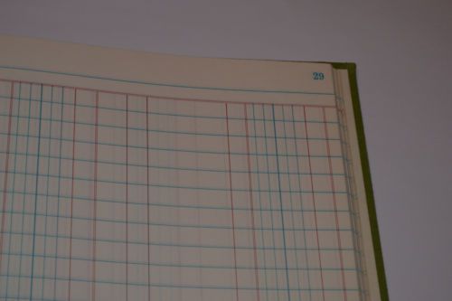USED WILSON JONES LEDGER, W/ 32 PAGES, 16 COLUMN ENTRY AND EXPANSION EXTENSION