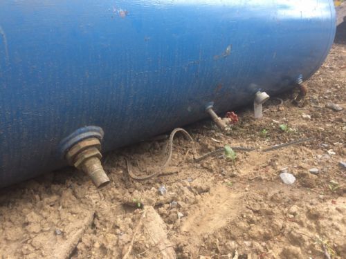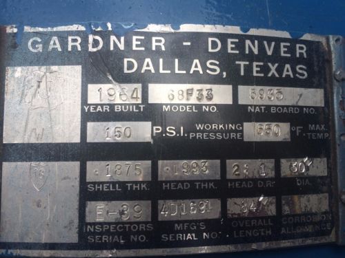 | “Used, painted steel air receiver tank that is in good condition. This tanks pressure rating is 150 psi @ 650 deg. date of manufacture is 1964. National Board # 5935.” |