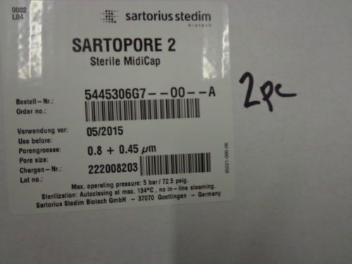 2pc Sartorius Stedim Sartopore 2 sterile midicap 0.8+0.45um filter capsules 5445306G7--OO--A Condition: Brand New. Actual item pictured. Filtrationarea: 0,05 - 0,45 m² Ready-to-use disposable filter capsules for bioburden & defined particle reduction of biological solutions. They are used for prefiltration of aqueous solutions and highly viscous & difficult to filter pharmaceutical products in pilot & small scale biotech manufacturing. Disposable MidiCaps® for Process Scale Reduction of Cleaning & Cleaning Validation Proven Performance of Sartopore® 2 Description Sartopore® 2 0.45 ?m membrane filter MidiCaps are self contained, ready to use filter units for bioburden reduction and particle removal from a broad range of pharmaceutical products. Membrane prefiltration of aqueous solutions and highly viscous pharmaceutical products difficult to filter can effectively be accomplished due to the outstanding total throughput and flow rate performance of Sartopore® 2 0.45 ?mMidiCaps. Applications: Typical applications include bioburden reduction and particle removal from: – Therapeutics – Injectables – Buffers – Biological Fluids – Tissue Culture Media – Acetic and basic solutions. Compatibility: The polyethersulfone membrane is compatible with a pH-range from pH 1 to pH 14 making Sartopore® 2 MidiCaps ideal for filtration of solutions with high |low pH. Easy to use: Sartopore® 2 MidiCaps are delivered as individually packed sterile units. On site, pre-use sterilization can be eliminated. Flexibility: Sartopore® 2 0.45 ?m MidiCaps are available with various filtration areas from 500 cm² | 0.5 ft² up to 0.45 m² | 4.5 ft² and various connector styles for easy adoption to any filtration process independent from the batch size. Scalability: Consistent and predictable scale-up and down trials can reliably be performed as all Sartopore® 2 filter elements are produced with the same type of membrane and materials and identical construction. Cost Saving: The use of the disposalbe capsule design concept avoids investments into stainless steel filter housings and eliminates additionalcosts for cleaning of housings and cleaning validation. Microbiological Retention: Sartopore® 2 filter MidiCaps 0.45 ?m rated are fully validated with a Log Reduction Value (LRV) of 7 for Serratia Marcescens according to HIMA and ASTM F-838 05 procedures. Quality Control: Each individual element is tested for integrity by B.-P. and Diffusion-Test prior to be released assuring absolute reliability. Documentation: Sartopore® 2 MidiCaps are designed, developed and manufactured in accordance with a ISO 9001 certified Quality Management System. A Validation Guide is available for compliance with regulatory requirements. Applications: Typical applications include bioburden reduction and particle removal from: Therapeutics Injectables Buffers Biological Fluids Tissue Culture Media Acidic and basic solutions Compatibility: The polyethersulfone membrane is compatible with a pH range from pH 1 to pH 14 making Sartopore® 2 MidiCaps ideal for filtration of solutions with high | low pH. Easy to Use: Sartopore® 2 MidiCaps are delivered as individually packed sterile units. On site, pre-use sterilization can be eliminated. Flexibility: Sartopore® 2 0.45 ?m MidiCaps are available with various filtration areas from 500 cm² | 0.5 ft² up to 0.45 m² | 5 ft² and various connector styles for easy adoption to any filtration process independent from the batch size. Scalability: Consistent and predictable scale-up and down trials can reliably be performed as all Sartobran® P filter elements are produced with the same type of membrane and identical materials of construction. Cost Saving: The use of the disposable capsule design concept avoids investments into stainless steel filter housings and eliminates additional costs for cleaning of housings and cleaning validation. Microbiological Retention: Sartopore® 2 MidiCaps 0.45 ?m rated are fully validated with a Log Reduction Value (LRV) of 7 for Serratia Marcescens according to HIMA and ASTM F-838 05 procedures. Quality Control: Each individual element is tested for integrity by B.-P. and Diffusion-Test prior to be released assuring absolute reliability. Documentation: Sartopore® 2 MidiCaps are designed, developed and manufactured in accordance with a ISO 9001 certified Quality Management System. A Validation Guide is available for compliance with regulatory requirements. Product properties Branch Pharma / Biotech Filter type Filter Capsules Type Sterile filter Filtration area 0,05 m² Membrane filter material Polyethersulfone (PES) Technical attributes Support Layers Polypropylene (PP) Structural Compounds Polypropylene (PP) Outer diameter 77 mm Overall length Connector Combinations SS & FF: 0.05 m² | 0.5 ft²: 115 mm; 0.1m² | 1 ft²: 148 mm; 0.2 m² | 2 ft²: 197 mm; 0.45 m² | 5 ft²: 330 mm Min. required Bubble Point 2.2 bar | 32 psi Max. allowed air diffusion at 20 °C: 0.05 m² | 0.5 ft²: 3 ml/min at 1.7 bar | 25 psi; 0.1 m² | 1 ft²: 4 ml/min at 1.7 bar | 25 psi; 0.2 m² | 2 ft²: 6 ml/min at 1.7 bar | 25 psi; 0.45 m² | 5 ft²: 12 ml/min at 1.7 bar | 25 psi Bacterial Endotoxins < 0.18 EU/ml as determined by the LAL test Extractables Product meets or exceeds the Quality standards set for "Sterile Water for Injection" by the current USP. Biosafety All materials of this filter element meet the requirements of the current USP Biological Reactivity tests <88> for plastics Class VI, (Systemic Injection, Intracutaneous and Implantation tests). Sterilisation Autoclaving: Min. 25 cycles at max. 134 °C, 2 bar | 29 psi, 30 min. Non-Fiber Releasing This product complies with the title 21 of the Code of Federal Regulations (CFR), section 210.3(b)(6) and 211.72 GMP Compliance This product was manufactured in conformance with established Current Good Manufacturing Practice (cGMP) standards. Membrane material Polyethersulfone (PES) Max. Differential Pressure 20 °C: 5 b
