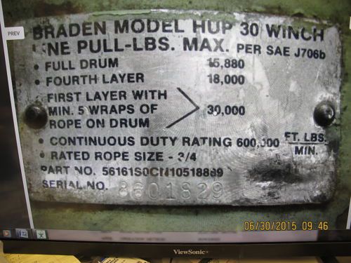 BRADEN PD15B HOISTING WINCH, 15,000 LB CAPACITY, PD15B-41V049/027-05 PN. 06420