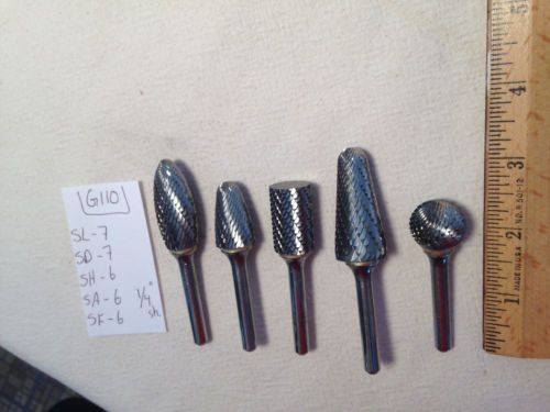 5 NEW 1/4" (.250) SHANK CARBIDE BURRS. DOUBLE CUT SL-4, SF-5, SL-3, SA-3 {G108}