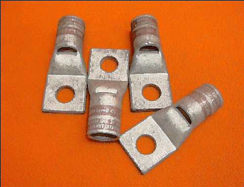 Offering 4 new but not in box T&B compression lugs. These are two hole lugs for 500 MCM copper wire. Color coded for proper die selection