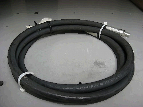 This is a new hose with a rubber outer jacket. It is rated at 5000 PSI and it has a #6 JIC female at one end and a #6 JIC male at the other. The hose is 48 inches overall.