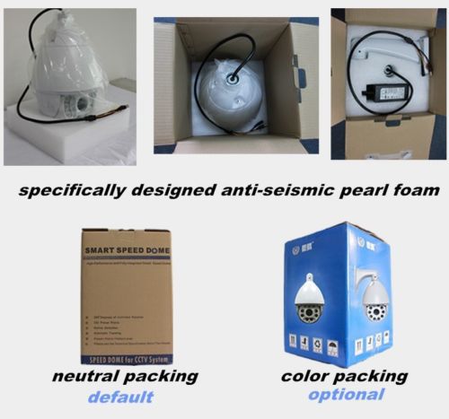 700TVL 36X Optical Zoom IR high speed Ptz Dome cctv Camera outdoor onvif DT801 Description 7" Analog 700TVL high speed dome PTZ Camera with 36x zoom 120M IR for outdoor waterproof camera, support onvif If you have any questions about our cameras, please don't hesitate to contact us. Product introduction: IR lights: 10 LED array lights 1.5 W ( Laser lights optional) IR lighting distance: 150 meters Image sensor:1/3" CMOS Horizontal resolution:700 TVL Signal model:PAL/NTSC Backlight compensation:On/Off 7 inch New high strength aluminum alloy structure, effectively prevent the deformation and keep the stable structure IR light self-inspection when suply electricity White balance:Auto Total Metal shell Focus length:4.5~94mm Temperature control:build in Optical zoom:36X Onvif:support Communication:Multi-protocol, RS485 Min. illumination:Color: 0.01 Lux \ B/W: 0 Lux Precision stepper motor driver Automatic identification of SONY, LG, SAMSUNG, CNB, CANNON, YOKO, MTK, etc Pan rotation 360°continuous, vertical 0 ° ~ 90 °, Auto reverse:180° Pan Speed 0°~ 160°/s Tilt Speed0°~ 90°/s Focus:Auto/manual/zoom 256 Preset,Patrol:4 Support multi-protocol, Baud rate adjustable Built-in surge and lightning protection device Optional installation: lifting, wall mounting The cruise line programmable Settings Waterproof: IP66 Support horizontal, two areas, random scan Continuous horizontal scan 360 ° Patrol speed variable The retention period of preset point can be set separately Percentage change times features Restore factory Settings function, power automatic information protection Power supply DC12V5A Work environment-35°C~+65°C Packing size: 285 mm * 275 mm * 425 mm Specification: Product feature High strength aluminum alloy 7 inch casing, high-grade surface treatment technology. Using high reliability on STC CPU, internal set parameters is not lost when the power is cut off Automatic identification of mixer Pelco_P/Pelco_D yuntai control protocol It can invoke the shortcut key for multiple camera size set best far infrared lamp light open. It support 4 alarm input 1 road alarm output (optional) It can call shortcut keys to set the camera function Pieces have access to electricity, electricity automatically after power on before the default action Pieces have to guard a function, no operation within 30 seconds automatically return to preset a 1 Pan rotation 360°continuous, vertical 0 ° ~ 90 °, Auto reverse:180° Pan Speed 0°~ 160°/s Tilt Speed0°~ 90°/s Preset: 256 Manual speed: level 0.1 °, 40 ° /s, vertical 0.1 ° ~ 25 ° / s Preset speed: level 40 °/ s,vertical 20 ° /s, A variety of automatic scanning mode, scanning speed is high, medium and low three grades Patrol function:8 groups preset Support wide dynamic, backlight compensation operation function Color/black and white video camera can be set according to the environment into the single color or the black model Built-in surge and lightning protection device Constant temperature device: radiator, Installation method: wall and lifting/standard wall Power supply: standard DC12V5A Camera parameter Signal system: PAL/NTSC Image sensor:1/3” CMOS Horizontal resolution: 700 (700 lines, 600 lines, 650 lines optional) Infrared: double filter day/night: automatic switch/linkages, super infrared transmittance 82% or higher Video output: 1.0 + / - 0.2 the Vp - p S/N manic ratio: or greater acuity 52 db Minimum illumination: color 0.2 LUX (normal), black and white 0.02 LUX (in real time Day & Night : IR-CUT dual filter switch, day& night auto switch Control: automatic/manual Backlight compensation: (NO/OFF)/strong inhibition (HSBLC) Lens: F1.4-F3.0 f=3.9~85.8mm Optical focus: 36x 2 d digital noise reduction switch: on/off Focus mode: automatic/keyboard automatic Video output: 1.0Vp-p ,(75 ohm composite video) High-speed shutter: automatic / 1/50-1/10000 SEC Mirror: support horizontal Automatic gainAGC: ( 0-15) amplitude is adjustable The white balance Settings: automatic/automatic tracking/indoor/outdoor/manual mode PTZ parameter Rotating speed: Horizontal 0.1 ° ~ 40 ° / s; Vertical 0.1 °, 40 ° / s Preset speed: Horizontal 40 ° / s, Vertical 40 ° / s Rotation Angle: Horizontal 0 ° ~ 360 ° continuous rotation; Vertical 0 ° ~ 90 °, auto reverse:180° A - B scan: set arbitrary A - B scanning speed: three gear speed is adjustable Tour: 8 groups (each group of eight preset) Preset: 256 Alarm input: 4 road (optional) Alarm output: 1 road (optional) Electricity action: have Guard: have Control mode: RS485 bus control Communication baud rate: 1200 BPS / 2400 BPS / 4800 BPS to 9600 BPS Communication protocol: adaptive Pelco_P/Pelco_D Address range: 1-256 IR lights IR Distance: 10pcs Array leds (Laser lights optional) 150 meters IR distance Automatic control infrared lights: Automatically switch near or far infrared lights/manual/far light/near lights according to the camera focal length Product structure Product size: 7 inch The shell material: aluminum alloy Scaffold material: aluminum alloy Warehouse material: ABS plastic alloy Power Supply: standard DC12V5A (24V3A optional) Power consumption: 40 w (with no heater) / 70 w (with heater) Working temperature: 25 ° C to 70 ° C (with no heater) / - 50 ° C to 70 ° C (with heater) Waterproof Criterion : IP66 Installation method: wall and lifting/standard wall Product package Packing size: 285 mm * 275 mm * 425 mm The packing gross weight: 5.3 Kg 1 x 1/3 inch CMOS CCTV PTZ Surveillance Speed Dome Security Camera 1 x 12V 5000mA AC Adapter 1 x Bracket 1 x Mounting Screws and Screw Caps Package 1 x User Manual All our camera can Accept your company Logo,Welcome your contact with us for the quotation list! Payment We will accept your payment by paypal only. Shipping Shipping 1. We ship the product to address provided by Ebay,please make sure the address is right,and you could receive the package. 2. All the items will be checked before shipped out.Please rest assured that quality is ensured. 3.
