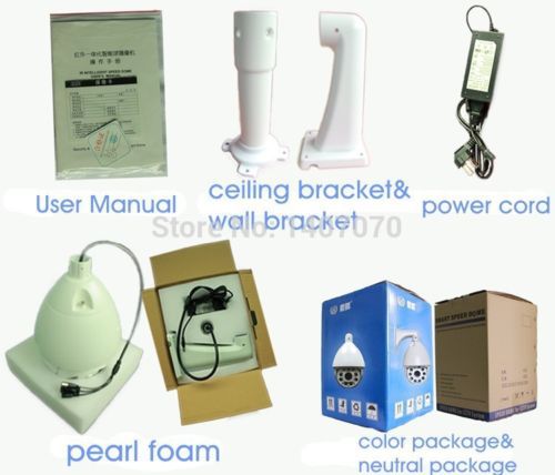 700TVL 36X Zoom laser IR medium speed Ptz Dome cctv Camera outdoor onvif DT502 Description 700TVL 36X Zoom 2 Laser Lights CCTV IR medium Speed Ptz Dome Camera outdoor Onvif DT502 Product introduction: IR lights: 6 LED array lights+2 Laser Lights IR lighting distance: 150 meters Image sensor:1/3" CMOS Horizontal resolution:700 TVL Signal model:PAL/NTSC Backlight compensation:On/Off 7 inch New high-strength aluminum alloy structure, effectively prevent the deformation and keep the stable structure IR light self-inspection when suply electricity White balance:Auto Total Metal shell Focus length:4.5~94mm Temperature control:build in Optical zoom:36X Onvif:support Communication:Multi-protocol, RS485 Min. illumination:Color: 0.01 Lux \ B/W: 0 Lux Precision stepper motor driver Automatic identification of SONY, LG, SAMSUNG, CNB, CANNON, YOKO, MTK, etc Pan rotation 360°continuous, vertical 0 ° ~ 90 °, Auto reverse:180° Pan Speed 0°~ 40°/s Tilt Speed0°~ 25°/s Focus:Auto/manual/zoom 256 Preset,Patrol:4 Support multi-protocol, Baud rate adjustable Built-in surge and lightning protection device Optional installation: lifting, wall mounting The cruise line programmable Settings Waterproof: IP66 Support horizontal, two areas, random scan Continuous horizontal scan 360 ° Patrol speed variable The retention period of preset point can be set separately Percentage change times features Restore factory Settings function, power automatic information protection Power supply DC12V5A Work environment-35°C~+65°C Packing size: 285 mm * 275 mm * 425 mm Specification: Product feature High strength aluminum alloy 7 inch casing, high-grade surface treatment technology. Using high reliability on STC CPU, internal set parameters is not lost when the power is cut off Automatic identification of mixer Pelco_P/Pelco_D yuntai control protocol It can invoke the shortcut key for multiple camera size set best far infrared lamp light open. It support 4 alarm input 1 road alarm output (optional) It can call shortcut keys to set the camera function Pieces have access to electricity, electricity automatically after power on before the default action Pieces have to guard a function, no operation within 30 seconds automatically return to preset a 1 Pan rotation 360°continuous, vertical 0 ° ~ 90 °, Auto reverse:180° Pan Speed 0°~ 40°/s Tilt Speed0°~ 25°/s Preset: 256 Manual speed: level 0.1 °, 40 ° /s, vertical 0.1 ° ~ 25 ° / s Preset speed: level 40 °/ s,vertical 20 ° /s, A variety of automatic scanning mode, scanning speed is high, medium and low three grades Patrol function:8 groups preset Support wide dynamic, backlight compensation operation function Color/black and white video camera can be set according to the environment into the single color or the black model Built-in surge and lightning protection device Constant temperature device: radiator, Installation method: wall and lifting/standard wall Power supply: standard DC12V5A Camera parameter Signal system: PAL/NTSC Image sensor:1/3” CMOS Horizontal resolution: 700 (700 lines, 600 lines, 650 lines optional) Infrared: double filter day/night: automatic switch/linkages, super infrared transmittance 82% or higher Video output: 1.0 + / - 0.2 the Vp - p S/N manic ratio: or greater acuity 52 db Minimum illumination: color 0.2 LUX (normal), black and white 0.02 LUX (in real time Day & Night : IR-CUT dual filter switch, day& night auto switch Control: automatic/manual Backlight compensation: (NO/OFF)/strong inhibition (HSBLC) Lens: F1.4-F3.0 f=3.9~85.8mm Optical focus: 36x 2 d digital noise reduction switch: on/off Focus mode: automatic/keyboard automatic Video output: 1.0Vp-p ,(75 ohm composite video) High-speed shutter: automatic / 1/50-1/10000 SEC Mirror: support horizontal Automatic gainAGC: ( 0-15) amplitude is adjustable The white balance Settings: automatic/automatic tracking/indoor/outdoor/manual mode PTZ parameter Rotating speed: Horizontal 0.1 ° ~ 40 ° / s; Vertical 0.1 °, 40 ° / s Preset speed: Horizontal 40 ° / s, Vertical 40 ° / s Rotation Angle: Horizontal 0 ° ~ 360 ° continuous rotation; Vertical 0 ° ~ 90 °, auto reverse:180° A - B scan: set arbitrary A - B scanning speed: three gear speed is adjustable Tour: 8 groups (each group of eight preset) Preset: 256 Alarm input: 4 road (optional) Alarm output: 1 road (optional) Electricity action: have Guard: have Control mode: RS485 bus control Communication baud rate: 1200 BPS / 2400 BPS / 4800 BPS to 9600 BPS Communication protocol: adaptive Pelco_P/Pelco_D Address range: 1-256 IR lights IR Distance: 6pcs Array leds +2 Laser lights,150 meters IR distance Automatic control infrared lights: Automatically switch near or far infrared lights/manual/far light/near lights according to the camera focal length Product structure Product size: 7 inch The shell material: aluminum alloy Scaffold material: aluminum alloy Warehouse material: ABS plastic alloy Power Supply: standard DC12V5A (24V3A optional) Power consumption: 40 w (with no heater) / 70 w (with heater) Working temperature: 25 ° C to 70 ° C (with no heater) / - 50 ° C to 70 ° C (with heater) Waterproof Criterion : IP66 Installation method: wall and lifting/standard wall Product package Packing size: 285 mm * 275 mm * 425 mm The packing gross weight: 5.3 Kg 1 x 1/3 inch CMOS CCTV PTZ Surveillance Speed Dome Security Camera 1 x 12V 5000mA AC Adapter 1 x Bracket 1 x Mounting Screws and Screw Caps Package 1 x User Manual All our camera can Accept your company Logo,Welcome your contact with us for the quotation list! Payment We will accept your payment by paypal only. Shipping Shipping 1. We ship the product to address provided by Ebay,please make sure the address is right,and you could receive the package. 2. All the items will be checked before shipped out.Please rest assured that quality is ensured. 3. Item will be shipped within 1 business day after received a verified payment. 4. Shipped by air mail which normally takes 15-28 busi