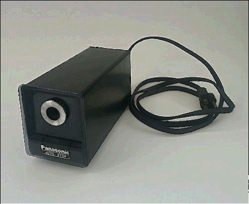 Vintage Panasonic electric auto-stop pencil sharpener. Item has been tested and operates as designed. No cracks, breaks or repairs noted on unit or shavings tray.