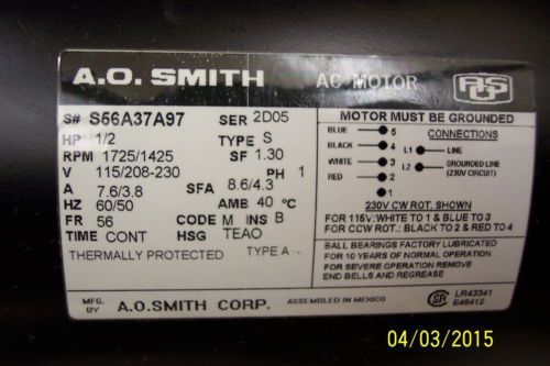 C047 1/2 HP, 1100 RPM NEW AO SMITH ELECTRIC MOTOR
