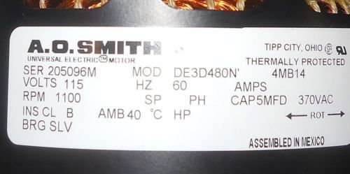 A.O. SMITH BLOWER MOTOR Model DE3D480N 4MB14, 1100 RPM, 60HZ ---- Listing #14