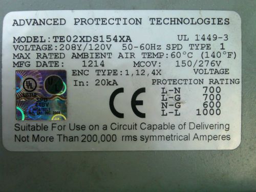APT TE/400XHP ADVANCED PROTECTION TECHNOLOGIES SURGE SUPPRESSOR 480V-AC B235299