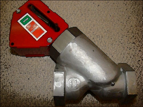 Ansul 2" mechanical natural and LP gas valve manufactured by Tyco, fires suppression and building products, Marinette, WI. This includes air cylinder assembly Ansul, Part 15733. Complies w/ EN161:1991, class, group 2, remote pneumatic piston actuator, required 6.9 bar.