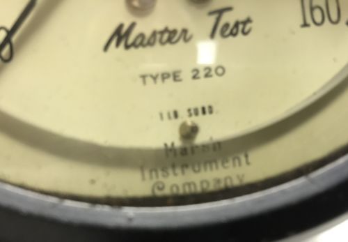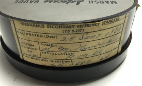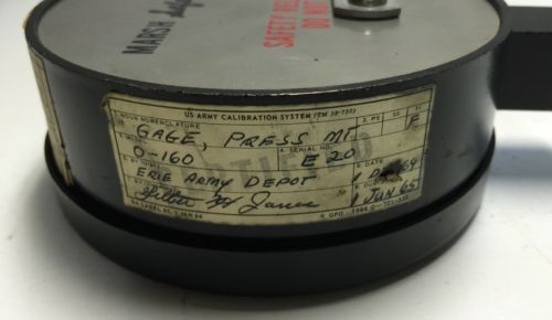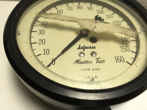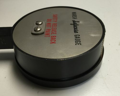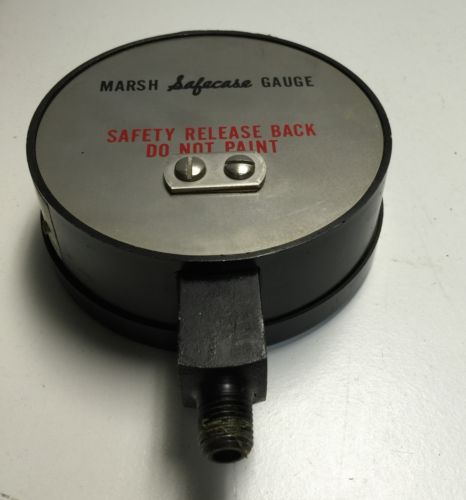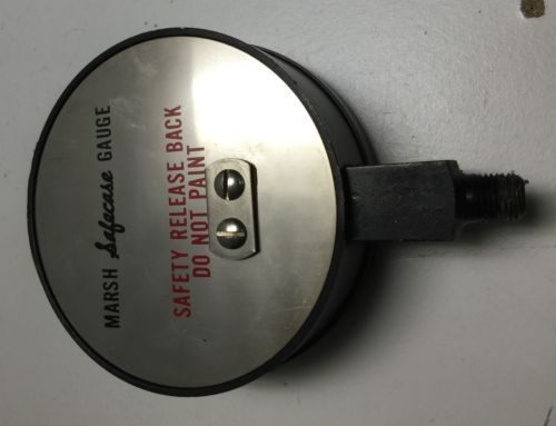 | “This listing is for an Antique 4" MARSH SAFECASE MASTER TEST TYPE 220 160 PSI GAUGE featuring the Safety Release Back. The cosmetic condition of this gauge is very good plus. This gauge was last tested on December 1, 1964 by a US Army inspector. This gauge is being sold as-is, I have not tested it, yet I would not be the least bit surprised to find that it is in good working order and just in need of a recalibration.” |