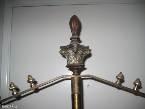 | Seller Notes | “It's in pretty good condition...it has a nicely-aged patina with some oxidation, and bits of surface rust on the base...there's a few small areas of some slightly-advanced rust on the underside of the base, but nothing that is an issue, and no one will see. A painter wasn't careful in covering it, and there are a few small bits of white paint seen within the crevices of the relief on the top ornament that can easily be removed...there was a small bit on the base and it scraped off easily. If you refurbish it, I'm sure a light sanding, some metal cleaner, and sealer should spruce it up nicely. If you want to use it now, it will be just fine to hang rugged or dark colored items like coats, etc. As you can see in the photos, one decorative cone is off, and only missing its screw...easy enough to replace...I'll look around to see if I have it. There is an extra hole on each arm, but it came with 10 cones on it. I checked each cone and screw assembly, and all the threading is intact.” |