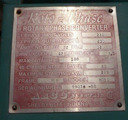 Roto-Phase Rotary Phase Converter Machinery MODEL R - 7.5 ? 25hp