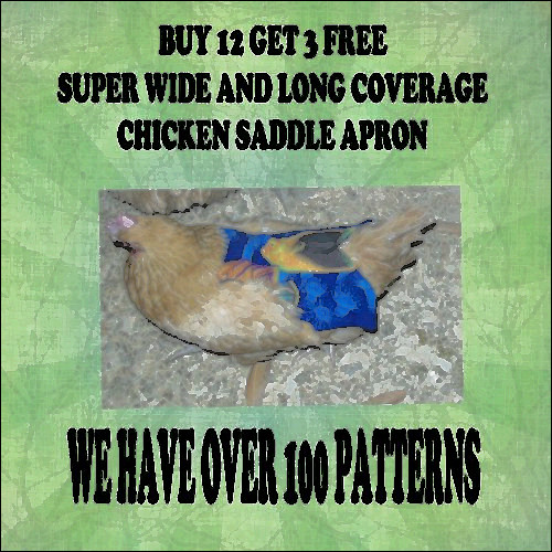 WELCOME TO FEATHER FASHION DIVA'S SPECIAL PRICE: BUY 3 GET 1 FREE please note: THE ANGLE WING DESIGN chicken saddle apron NOW HAS A patent number through the U.S. Patent Office and should not be purchased to copy or resell. The Angle Design and add on's, such as the collar for the deluxe and the tail for the tail feather coverage is all part of OUR design.