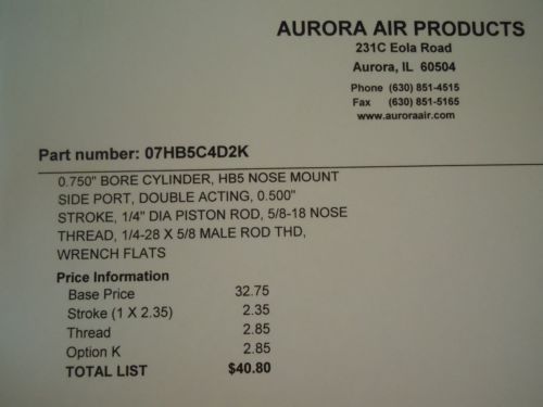 AURORA HB-12 AIR/ PNEUMATIC CYLINDER never been used 3/4" bore 1" stroke