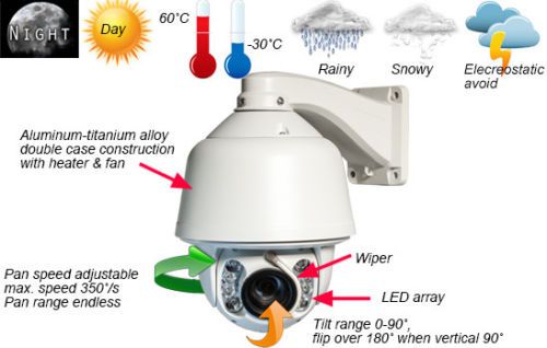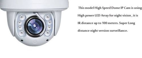 DT903 Auto Tracking 20X High-Speed 150M IR 1.3MP 960P HD ptz IP camera with wiper Description Auto Motion Tracking PTZ IP Camera outdoor 1.3MP full HD 1280*960P High speed dome camera 20x Zooms cctv camera DT903 Specifications 960P 1.3MP IP IR PTZ Camera 1. 20X zoom 2. 150m IR range 3. WDR/ DNR(2D&3D) 4. 1/2.7\'\'CMOS Feature High Quality 1.3 megapixel 20x Speed Dome Panasonic outdoor security cam 1/2.7\'\'Exmor CMOS Sensor ,WDR,DNR(2D &3D) 20x zoom, 12digital zoom 1.3MP high resolution 150m IR Range,IP66 Rating Specification Model DT903 Image Sensor 1/2.7" Exmor CMOS Effective Pixels 1280(H)x960(V) Minimum Illumination Color: 0.5Lux F1.6, B/W: 0.02Lux F1.6 White Balance Auto / Manual / One Touch WB / ATW Min. Illumination Color: 0.05Lux (F1.6, AGC ON), B/W: 0.005Lux (F1.6, AGC On); 0 Lux with IR White Balance Auto/Manual/ATW/Indoor/Outdoor/Daylight lamp/Sodium lamp AGC Auto/Manual S/N Ratio >50dB Day & Night IR Cut Filter Digital Noise Reduction 3D DNR Wide Dynamic Range Digital WDR Shutter Speed 50Hz: 1~1/30,000s; 60Hz: 1~1/30,000s Focus Mode Auto/Semiautomatic/Manual Enhancement Smart Defog: on/off Focal Length 4.7 ~ 94mm, 20x Zoom Speed Approx 2.7s(Optical Wide-Tele) Angle of View 58.3 ~ 3.2 degree (Wide-Tele) Min. Working Distance 10 ~ 1,500mm (Wide-Tele) Aperture Range F1.6 ~ F3.5 IR Distance 150M Day& Night ICR Auto Focus Auto / Semi-automatic / Manual Ethernet 10Base -T, /100Base-TX, RJ45 Connector Max.Image Resolution 11280×960 Frame Rate 50Hz:25fps( 1920×1080P),25fps((1280×720P) 60Hz:30fps( 1920×1080P),30fps((1280×720P) Image Compression H.264 Protocols TCP/IP, HTTP, DHCP, DNS, RTP/RTCP, RTSP, PPPoE, SMTP, NTP (FTP, SNMP optional) No. of Users Up to 6 user Dual Stream Support User/Host Level 3 Levels: Administrator, Camera control, Live view online Protocols IPv4/IPv6, HTTP, HTTPS, 802.1x, Qos, FTP, SMTP, UPnP, SNMP, DNS, DDNS, NTP, RTSP, RTP, TCP/IP, UDP, IGMP, ICMP, DHCP, PPPoE Simultaneous Live View Up to 10 Streams Three Streams Mini SD Memory Card built in 8g sd (The price does not include the SD card) User/Host Level Up to 32 users, 3 Levels: Administrator, Camera control, Live view only Application programming Open-ended API, support Onvif, PSIA and CGI Camera Control Pan/Tilt, Zoom, Focus, Click centering, Zoom by mouse dragging, Iris, preset calling and programming, auto mode Client software Support iVMS-4200 PCNVR Web Browser IE 7, IE 8, IE 9, Chrome 8+, Firefox 3.5+, Safari 5+, support multi-language Auto tracking support Security Measures User authentication (ID and PW), host authentication (MAC address) Pan Range 360° endless Pan Speed High Speed: 0.01° ~ 200° /s Low Speed: 0.01° ~ 35° /s Tilt Range -5° ~ 92° (auto flip ) Tilt Speed High Speed: 0.01° ~ 120° /s Low Speed: 0.01° ~ 35° /s Pan preset speed High Speed: 250° /s Low Speed: 35° /s Number of Preset 255 Pattern 4 patterns, with the recording time not less than 10 min per pattern 3D Position Yes Proportional Zoom Rotation speed can be adjusted automatically according to zoom multiples Working Temperature/ Humidity -40°C ~ 75°C (-22° F ~ 149° F), 90% or less Protection Level IP66 with TVS 4000V lightning protection, surge protection and voltage transient protection Power Supply DC12V±10% (AC24V±10% optional) Power Consumption 40W MAX Color / Material White / Aluminum Net Weight(approx.) 8.0Kg (8.8Ibs) Payment We will accept your payment by paypal only. Shipping Shipping 1. We ship the product to address provided by Ebay,please make sure the address is right,and you could receive the package. 2. All the items will be checked before shipped out.Please rest assured that quality is ensured. 3. Item will be shipped within 1 business day after received a verified payment. 4. Shipped by air mail which normally takes 15-28 business days for arrival. If you need faster shipping service, please contact us. 5. Delivery Time upon purchase Locations Australia, South East Asia and Asia 15-18 working days; United Kingdom, United States and Canada 12-21 working days; Europe, South America, Middle-East Asia 16-28 wrokging days 6. Something may happened during the shipping are out of our control,if you find any problems when you receive the package,please contact us,we will try our best to solve them. Return Policy Return Policy & Feedback If there are any problems with our products,Please feel free to contact us.We will always here to solve them for you.You don't need to contact ebay or paypal.And please DO NOT leave us Neutral/negative feedback,It won't help the problem to be solved.And it is the worst hurst to a seller.We should try our best to make a happy easy transaction. If you are satisfied with our products and our service,please tell your friend and leave us positive feedback;if you are not satisfied with our products or service,please DO tell us. After receiving the item,you could contact us within 30 days.Refund will be given as money back or item exchange. About us Quality Assurance Every item sold on eBay fresh-feeling is: 100% Authentic. Brand new (Unless the description says used), first quality, with all original parts and authentic. Original manufacturer's serial numbers intact. Not refurbished, factory seconds, or replica products. Have a 1 to 5 year warranty program. Contact us Contact Us Working Day: Monday to Saturday Working Time: 9:00 am to 19:00 pm (GTM +8:00 Beijing) If anything we could help you,please feel free to contact us. Engineered for professional eBay sellers! On Mar-06-15 at 22:00:11 PST, seller added the following information: