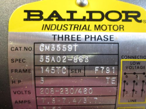 BALDOR 3 HORSEPOWER 208-230/460V 3 PHASE FRAME 145TC 3450 RPM CM3559T NEW H1414