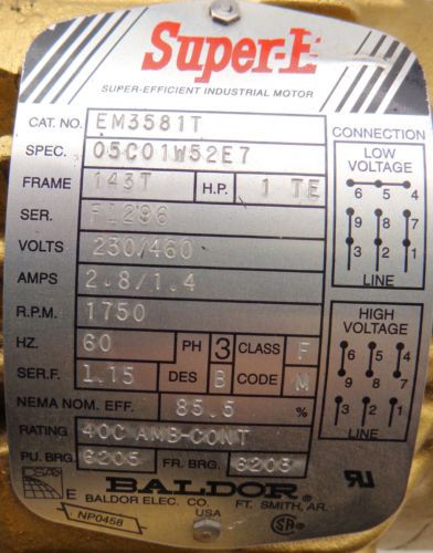 BALDOR SUPER E MOTOR CAT: CEM3661T 3HP 230/460V 1760RPM 182TC-FR 3PH USED
