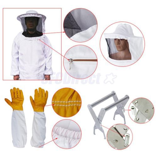 4PCs PRO Beekeeping Veil Suit Smock Hive Frame Holder Gloves, Bee Brush Tool kit