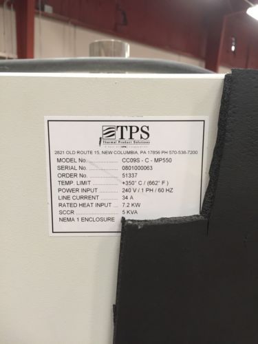 | “Thermal Product Solutions TPS Oven Model CC09S-C-MP550, this system is in great condition and is available for inspection. It is sold as it, where is and as shown. It comes with a manual and other miscellaneous attachments.” |