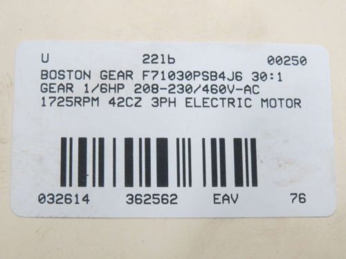 BOSTON GEAR F71030PSBG6 30:1 1/6HP 230/460VAC 1725RPM 42CZ GEAR MOTOR B362511