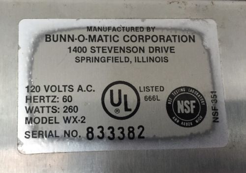 BUNN SINGLE BURNER SATELLITE WARMER / HEATER MODEL RWS-2