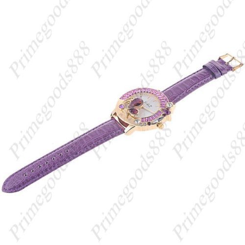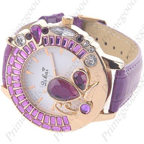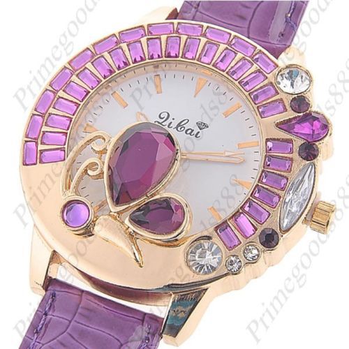 Butterfly Rhinestones PU Leather Quartz Wristwatch Lady Ladies Women's Purple