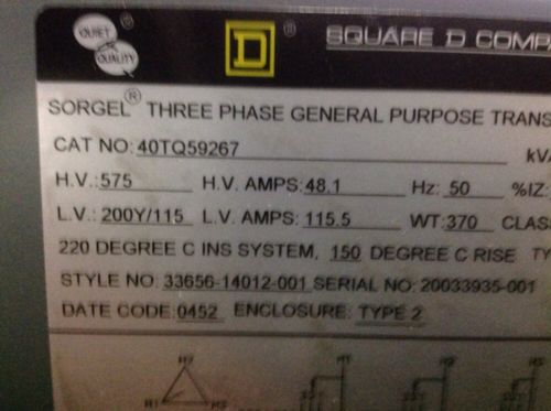 SQUARE D TRANSFORMER 9070 TF500D1 .500 KVA .500KVA HI:480V LO:120V 9070TF500D1