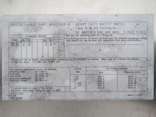Eaton Cutler Hammer DH661UWK 6 Pole 30A 600V Stainless