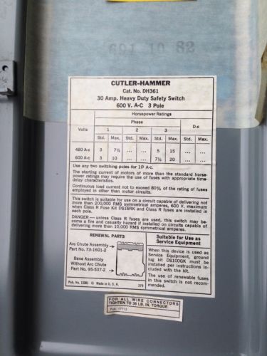 EATON DH361UGK CUTLER HAMMER HEAVY DUTY SAFETY SWITCH 30A 600 V 60Hz 250 V