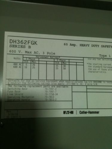 Eaton Cutler Hammer Disconnect On Off Safety Switch 60A 600V DH362FGK
