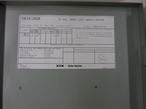 Cutler Hammer 1HD363NF 30 Amp, 3 Poles, 600V, Type 1, Non-Fusible Switch