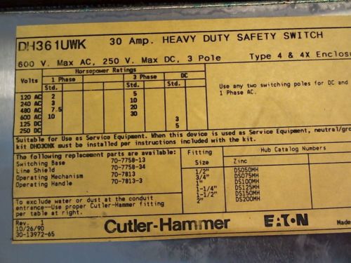 CUTLER HAMMER DH261UGK 30 AMP 600 VOLT HD SAFETY SWITCH NEMA 1