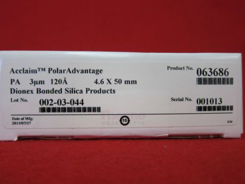 Dionex Acclaim Polar Advantage PA 3 µm 120A 4.6 X 50 mm Bonded Silica Products (New) Thermo Fisher Scientific P/N 057075-04, Product No. 063686 This item is in new condition and comes with our 30 days warranty. Please read the following terms of sale carefully. These terms constitute a legally binding agreement (contract) between the seller and buyer. By bidding on, or purchasing, the product posted in this eBay listing, the winning bidder agrees to and accepts all of the terms of sale stated below. TERMS OF SALE: Only what is shown in the eBay photo and mentioned in the listing is included, anything else should be understood to not be included. For sale is for the eBay item only, no service or tech support are included, but if you have a question feel free to ask and we'll answer if we can. All sales are final, please understand that this is an auction/liquidation environment, not a retail store, so make sure the item is right for you, before bidding. PAYMENT: We accept payment by Paypal, and we only ship to the address which the buyer provides within the Paypal payment, no exceptions. If you would like to pay with a non-Paypal payment method, please contact us before bidding to see if we can arrange something. Buyers are given 7 days from winning bid to pay, and payment is expected of all winning bidders If no payment is made within 7 days, an unpaid item reminder will be filed with eBay, and the buyer forfeits the auction win. We are required by state law to collect sales tax on all items shipping to a CA address. CA sales tax may be waived at our discretion, but only with a valid CA resale certificate - please contact us for resale exception *before* sending payment. DOMESTIC (US) SHIPPING: Local pickup is normally not available; exceptions are sometimes made, but only for higher-value orders. Please contact us first to see if we can make this arrangement for you, don't assume that we will be able to. We charge flat-rate shipping, and there is no extra cost to ship to AK, HI, PR, or PO boxes, these are all fine. Shipping cost includes packaging cost including time and materials, and also includes shipping insurance (either through carrier, or self-insure); we guarantee delivery to the address you provided, or else a refund if the carrier loses the package. Smaller items will normally ship USPS and heavier items will normally ship Fedex Ground. Heavier items going to AK, HI, PR, APO/FPO, or PO boxes will ship via USPS parcel post All items must be shipped using our shipping account, we don't use anyone else's account to ship items. Packages valued $250 or more will ship with signature required upon delivery. We cannot normally offer expedited or express shipping. If this is something that you crucially need, please contact us *before* bidding to see if we can do this for you. Items will normally ship within 2 business days from the date of payment clearing (but most items will ship the next business day). You can typically expect to receive your item in under a week for smaller items, or 5-9 days for larger heavier items shipping ground delivery. Combined shipping: take $3 off shipping for each auction won after the first, if the items are paid for together. FREIGHT SHIPPING: Oversized items (150+ LBs) may be picked up locally, or may be shipped freight, but scheduling the freight shipment is buyer's responsibility. Scheduling a freight shipment may be done at freightquote.com, or another freight broker or carrier, only a credit card is required. Freight shipping is from zip code 95134, commercial location, forklift available for loading, and outgoing shipments may be scheduled from 12 noon-6pm on weekdays. We can prepare the shipment for you upon request, palletizing, strapping down, and/or shrinkwrapping, there is a $25 palletizing fee. Bill of lading must be provided to us at least 24 hrs in advance of scheduling shipment, and ship-to address must match the shipping address in your Paypal payment. INTERNATIONAL SHIPPING: International bidders, please contact us about the possibility of international shipping, prior to bidding/purchasing, not all items may be shipped internationally. International buyers are responsible for additional costs of international shipping: shipping cost and also import duties / taxes of your country of residence. International shipping cost is NEVER refundable for any reason. Please only bid if you understand this. WARRANTY: All of our Ebay items are guaranteed to arrive working normally, and they come with warranty. If there is any problem with your order we will provide a replacement item or a refund, but we ask that you return the item PROMPTLY, please try to return it within 2 weeks, and should be received by us at the very latest 30 days after when you received the package. After 30 days we cannot accept any returns, unfortunately, so please check your purchase promptly and let us know if there happens to be any issue. Buyer is fully responsible for return shipping. Items must be returned in the same condition as shipped, with all included items - returning the item damaged or dismantled will void the warranty. We do not cross-ship, or ship any replacement, before the item is returned to us. Once the item is returned, we will ship a replacement item, if it's available. If a replacement isn't available, a full refund, including original shipping & handling charges, will be given. FEEDBACK:Before leaving neutral or negative feedback, please email instead, all issues can be fixed by communicating, we prefer to have satisfied customers COMMUNICATION: All communication is by email only, not phone - please use the "Ask seller a question" link in the auction page. All reasonable emails will be replied to, please allow 24-48 hours for a response, and check your email filter if you don't see a reply within 48 hours. Saturday, Sunday, and holidays are not business days so no reply should be expected during the weekend. Thank you for your patronage.