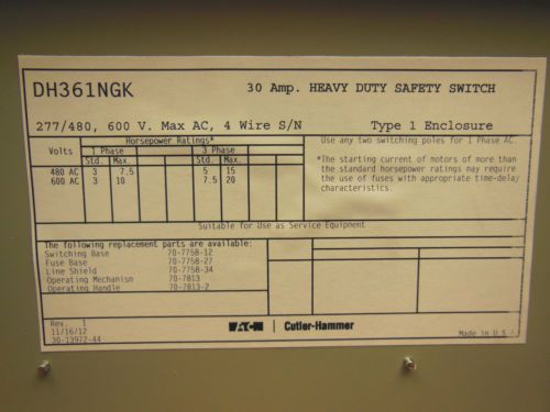 Cutler Hammer DH323NGK 100 amp 600v 3 p 3ph NEMA 1 Fused Safety Switch