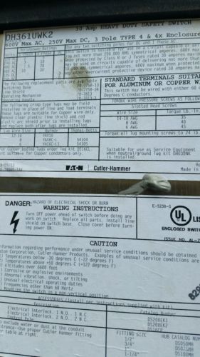 EATON STAINLESS STEEL DH261NWK HEAVY DUTY SAFETY SWITCH 30A 600V 60Hz 3 POLE