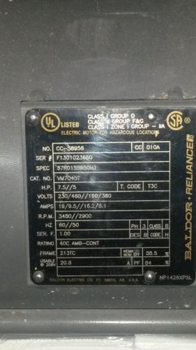 Baldor EM377OT Used 7.5 h.p. 19/9.5 amps 1770 rpm. 230/460 volts 3 ph.
