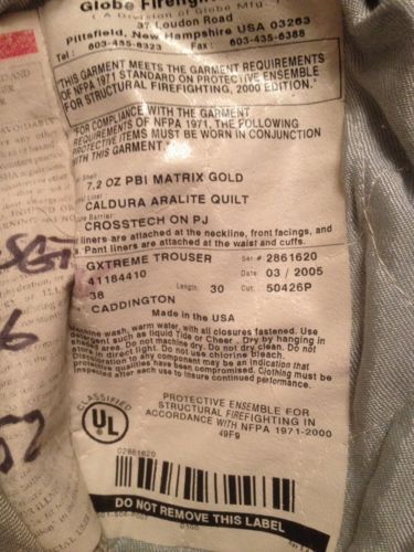 Firefighter PBI Bunker/Turn Out Gear Globe G Xtreme USED 38W X 28L 05' No Pocket