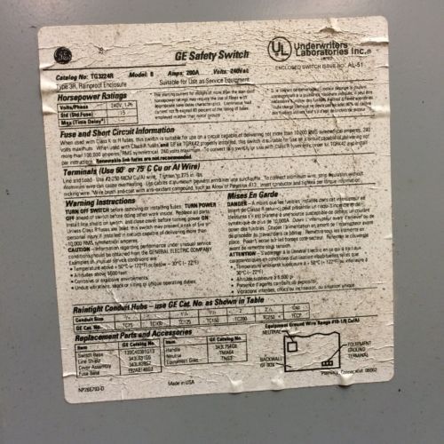 GE General Electric TG4325 400A 240V Fused Disconnect General Duty Safety Switch