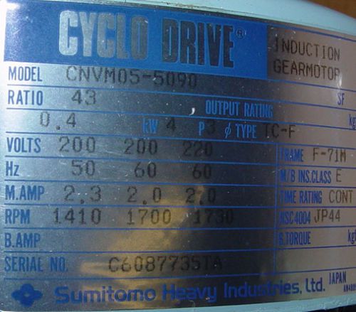 NEW Sumitomo SM-Cyclo Hyponic Drive RNFM01-20R0-B-120, 30 Day Warranty