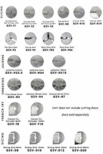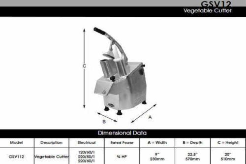 Details Payment Shipping Returns Customer Service General Commercial Vegetable Cutter 270 RPM 3/4 HP 220 Volts 1100 Watt Model GSV112 Product Additional Images General Commercial Vegetable Cutter 270 RPM 3/4 HP 220 Volts 1100 Watt Model GSV112 General Commercial Vegetable Cutter 270 RPM 3/4 HP 220 Volts 1100 Watt Model GSV112 CONDITION: New PLEASE READ BEFORE BIDDING *Due to the nature of our business of overstock and surplus inventory, there is a chance we will open the item to add packaging material for shipping. There is also the possibility of box damage due to warehousing and shipping. This does not affect the product in any way. If you have any doubts when receiving the item that the condition is other than what you received, please contact us before leaving feedback so we can resolve your issue. Also please read our shipping/return guarantee listed below. {disclaimer} Our company was created through the vision of the Harry Wiener family, who in the 1940's created the General Slicing Machine Co. The company, based in Brooklyn, NY, immediately became known for their hand operated slicers and hand crank meat grinders. These products became the foundation of the company's sales, with large retailers like Sears Roebuck & Co. and Montgomery Ward Co. featuring General heavily in their catalogs. With a name you have known and trusted since 1955, General features a variety of high quality mixers, slicers, meat processing equipment, vegetable and bowl cutters, coffee, tea, heating, and cooking equipment to meet all of your needs. The GSV112 vegetable cutter by General is at home in any medium to high volume production facility. Capable of cutting up to 500 lbs. per hour of fruits, vegetables, and cheeses, the GSV112 is the clear choice for slicing, dicing, shredding, julienne or French fry style cutting in any kitchen facility. Application Perfect for use in small to medium sized restaurants, schools, pizza shops, salad bars, supermarkets, sandwich shops, and more! Used for the preparation of fruits, vegetables, and cheeses. A volume production of up to 500 lbs. per hour can be achieved, depending upon the product. Features Cast aluminum polished body complete with a lid and 2 food chutes, one large semi-circle chute, and one smaller round chute Two food chutes for optimal efficiency The food pusher and lid are electrically interlocked to prevent operation if opened. All knives are stainless steel and completely replaceable Lid and pusher interlocked for safety Splash resistant push button on/off switch Supplied with food ejector plate A selection of 22 blades is available to produce sliced, diced, julienne, shredded, and French fry style cuts (Sold Separately) Specifications Model: GSV112 Description: Vegetable Cutter Voltage: 120/60/1; 220/50/1; 220/60/1 Wattage: 1100 Rated Power: 3/4 HP Speed: 270 RPM Power Supply: Cord & NEMA 5-15 grounded plug Weight: 49.5 lb Dimensions: 9" W x 22.5" D x 20" H' Warranty: 90 Days Parts & Labor 22 Optional Disc Selection Guide (Unit does Not include cutting Discs, discs sold separately) "Slicing" Curved Knife (GSV-E1): Soft Slicing 1mm - 1/32" Curved Knife (GSV-E2): Soft Slicing 2mm - 5/64" Curved Knife (GSV-E5): Soft Slicing 5mm - 3/16" Straight Knife (GSV-H8): Slicing 8mm - 5/16" Straight Knife (GSV-H10): Slicing 10mm - 3/8" Straight Knife (GSV-H14): Slicing 14mm - 9/16" Thin Slice (GSV-P2): 2mm - 5/64" Slicing (GSV-P4): 4mm - 5/32" Wavy Slice (GSV-PB2): 2mm - 5/64" Wavy Slice (GSV-PB4): 4mm - 5/32" "Julienne" GSV-HU2.5: 2.5mm - 3/32" GSV-HU4: 4mm - 5/32" GSV-HU10: 10mm - 3/8" "Shredding" GSV-H3: Fine Shred 3mm - 1/8" GSV-H4: Medium Shred 4mm - 5/32" GSV-H7: Coarse Shred 7mm - 9/32" "French Fry" (French Fry Plates T8 and T10 Require Choice of GSV-H8 or GSV-H10 to Function Properly) GSV-T8: Extruder 8mm - 5/16" GSV-T10: Extruder 10mm - 3/8" "Dicing" (Dicing grids D8, D10, and D12 require choice of GSV-H8 or GSV-H10 to function properly. Dicing Grid D20 requires GSV-H14 to function properly) GSV-D8: Grid 8mm - 5/16" GSV-D10: Grid 10mm - 3/8" GSV-D12: Grid 12mm - 5/8" GSV-D20: Grid 20mm - 3/4" If this item is described having a warranty, information can be found on our Ebay store below: Product Warranty Information available for viewing General Commercial Vegetable Cutter 270 RPM 3/4 HP 220 Volts 1100 Watt Model GSV112 {pic05} {pic06} {pic07} {pic08} {pic09} Payment terms & conditions If payment is not made within 5 days of the auction closing, our automated system will cancel the sale and file an Unpaid Item Dispute on eBay. Accepted Payment Methods: We accept the following methods of payment: PayPal Credit Cards via Phone Payment Requirements: Your shipping address must match your credit card billing address or PayPal confirmed address. For your protection, we are unable to ship to alternate addresses. No exceptions. We also require you to enter the CVV2 code number located on the back of your credit card. Sales Tax: Residents of PENNSYLVANIA will be charged 6.00% sales tax at checkout. Order Processing Time: We require up to one (1) business day to process your order. Security is our number one priority. Once we receive your information through the Internet, only trusted, authorized employees will process the payment to make sure your information is handled with the utmost security. No personal information will be sold or sent to third party marketing companies. Shipping & Handling Shipping charges are based on the item's weight to anywhere in the US (lower 48 states) and typically ship via FedEx Ground and FedEx Freight although occasionally a Common Carrier is used for large items i.e. refrigerators, ovens etc. Freight companies deliver items on a tractor trailer which is approximately (56) inches above the ground. These trailers are designed to load and unload at a loading dock with a forklift. If you do not have a loading dock for these large items that ship via common carrier we recommend a Lift Gate to safely unload your item. A Lift Gate is a mo