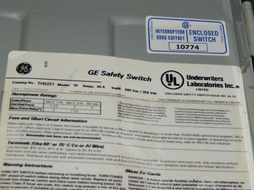 GE GENERAL ELECTRIC THN321 HEAVY DUTY SAFETY SWITCH 30A 3-POLE 240VAC ***XLNT***