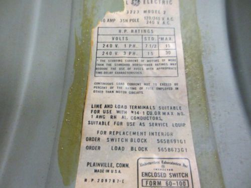 General Electric #TG3223 100A 240V 2P N-1 Fusible Safety SwitchManufacturer: GEModel/ Catalogue No: TG3223Part/ Type No: Age: AMPS: 100VOLTS: 240HZ: Ph/pole: 2PDimensions: 19-1/4" x 9-1/4" x 5"Weight: 14lb 7ozAdditional Specifications:Stock No. /Location: SHE-06B ERC’s Electric Team ~ If you have any questions regarding this item or other electrical items in our inventory, please contact ERC’s electrical guy, Bill Spearman. Bill has over 40 years of electrical experience and is available to assist you. Bill’s email: bills@equipmentrecon.com Bill’s phone #: (864) 237-5120 Bill works with a dedicated team, The Electric Eagles. This team appreciates your interest in this item they have detailed, photographed, inventoried, and prepared for shipment… they do all this just for you. The Electric Eagles: Chris Johnson, Terrance Collins and Andrew Hewson EQUIPMENT RESOURCE CONNECTION appreciates your interest in this item. QUESTIONS OR MULTI-LISTING DISCOUNT? CONTACT: Jamie Renfrow (864) 303-1512 jamier@equipmentrecon.com Virginia Melvin (864) 909-2102 vam@equipmentrecon.com Bill Spearman (864) 237-5120 bills@equipmentrecon.com **** This item may ship USPS **** About Equipment Resource Connection ERC buys & sells used machinery & equipment, including industrial process equipment, fabrication & industrial machinery, electrical parts, & industrial new & surplus parts, tooling and accessories. We are glad you have visited our store and are committed to delivering top quality customer service. Please contact us if you have any questions about our products, shipping or services. Equipment Resource Connection 1093 Barnwell Road Spartanburg, SC 29303 Email: esales@equipmentrecon.com Office Phone: 864-909-4260 / Office Fax: 864-803-5403 Jamie Renfrow 864-303-1512 Jack Whitmire 864-706-2384 Wanda Vaughn 843-598-1729 Virginia Melvin 864-909-2102 Bill Spearman 864-237-5120 Payments & Checkout We gladly accept payments through Pay Pal, credit card (including MasterCard, VISA, Discover and American Express), wire transfer, or cash. All purchases must be paid in full before shipment. Contact us if you have any questions regarding payment options. Shipment ERC ships worldwide and uses all common carriers including USPS, DHL, FEDEX, UPS and truck freight. *Shipping price shown is for shipping in the US to lower 48 states only. Orders are shipped within 1-3 days. Monday – Friday: On orders received and paid before noon eastern time, most orders are shipped the same day. Expedited shipping is available by most carriers. Contact us with any special shipping instructions. Shipping contact: Wanda Vaughn (864) 909-4260 Email: esales@equipmentrecon.com International Shipping International buyers, please contact us before you make your purchase for an international shipping quote. International Customers are responsible for all Customs fees, import taxes, VAT, and other fees applied by their respective countries. Per buyer’s request, shipments may be fully insured. Sales Terms Your complete customer satisfaction is our goal, and we make every effort to present detailed, accurate reports about each item we sell. The photographs and any video shown are of the actual item taken at time of inspection. We take pride in the products and services we provide. Equipment Resource Connection is not affiliated with, nor are we an authorized distributor or representative of any manufacturer, brand or product available for sale through our stores. As a general rule, the products we resell are no longer covered by the original manufacturer's warranty even when sold as new or in their original packaging. While we offer a guarantee on shipments, please note that our responsibility is limited to the cost of your purchase with us, as defined by the final selling price used in the transaction. Designated trademarks, brand names and brands appearing herein are the property of their respective owners. Every effort is made to note any missing hardware / manuals / inserts from NIB and NEW products, however, in most cases it is not known what was originally included. Unless a product is noted as Factory Sealed (FS) it may be missing something. If you have any doubt, please ask questions about hardware / manuals / inserts ahead of purchase. GUARANTEE ON PARTS, TOOLING AND ACCESSORIES Our product guarantee enables our customers to return an item for a full refund of the item purchase price. Let us know if item was not accurately described and represented or if the wrong item was shipped. Returns must be made within 14 days. GUARANTEE ON MACHINERY If any machine guaranteed by us does not prove satisfactory as represented, the purchaser may return if freight prepaid upon written notification within 14 days from date of receipt. This 14 day return policy applies only to product failure OR product returned unused with all packaging and inserts as it was received from Equipment Resource Connection. We will refund the purchase price in full within 10 days of receipt of the equipment in our facility. This does not apply to machines sold “as is” or “subject to inspection.” We regret that we cannot warranty equipment shipped to locations other than the continental USA. Your satisfaction is our priority -- please contact us immediately to discuss any questions or concerns you may have. Office Phone: 864-909-4260 Email: esales@equipmentrecon.com For any additional assistance contact Jamie Renfrow (864) 303-1512 / jamier@equipmentrecon.com Virginia Melvin (864) 909-2102/ vam@equipmentrecon.com Bill Spearman (864) 237-5120 bills@equipmentrecon.com At Your Service Remember that we are at your service. Feel free to contact us anytime. EQUIPMENT RESOURCE CONNECTION 1093 Barnwell Road Spartanburg, SC 29303 Hours: Monday - Friday 8:00am To 5:00pm (Eastern Time) Email: esales@equipmentrecon.com Office Phone: 864-909-4260 Powered by eBay Turbo Lister The free listing tool. List your items fast and easy and manage your active items.