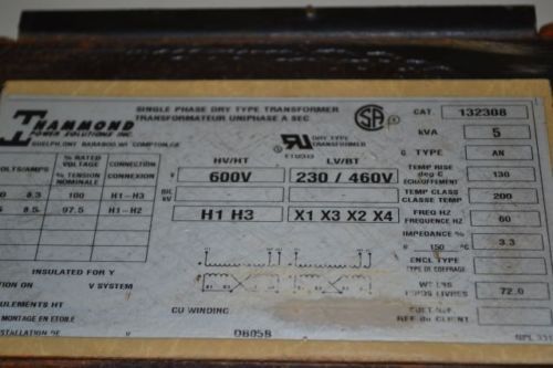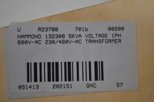 HAMMOND 132308 5kVA 1PH 600V-AC 230/460V-AC 60HZ TYPE G TRANSFORMER D202157