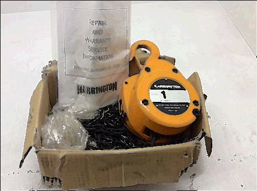 This is a open box Harrington L5LB015 1 1/2 ton chain come along if you have any questions please ask before bidding has 12'chain NEVER BEEN USED NEW