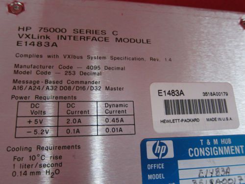 HP E1483A 75000 Series C VXLink Interface Module VXIbus This item is in good condition and it comes with our 30 days warranty. Please read the following terms of sale carefully. These terms constitute a legally binding agreement (contract) between the seller and buyer. By bidding on, or purchasing, the product posted in this eBay listing, the winning bidder agrees to and accepts all of the terms of sale stated below. TERMS OF SALE: Only what is shown in the eBay photo and mentioned in the listing is included, anything else should be understood to not be included. For sale is for the eBay item only, no service or tech support are included, but if you have a question feel free to ask and we'll answer if we can. All sales are final, please understand that this is an auction/liquidation environment, not a retail store, so make sure the item is right for you, before bidding. PAYMENT: We accept payment by Paypal, and we only ship to the address which the buyer provides within the Paypal payment, no exceptions. If you would like to pay with a non-Paypal payment method, please contact us before bidding to see if we can arrange something. Buyers are given 7 days from winning bid to pay, and payment is expected of all winning bidders If no payment is made within 7 days, an unpaid item reminder will be filed with eBay, and the buyer forfeits the auction win. We are required by state law to collect sales tax on all items shipping to a CA address. CA sales tax may be waived at our discretion, but only with a valid CA resale certificate - please contact us for resale exception *before* sending payment. DOMESTIC (US) SHIPPING: Local pickup is normally not available; exceptions are sometimes made, but only for higher-value orders. Please contact us first to see if we can make this arrangement for you, don't assume that we will be able to. We charge flat-rate shipping, and there is no extra cost to ship to AK, HI, PR, or PO boxes, these are all fine. Shipping cost includes packaging cost including time and materials, and also includes shipping insurance (either through carrier, or self-insure); we guarantee delivery to the address you provided, or else a refund if the carrier loses the package. Smaller items will normally ship USPS and heavier items will normally ship Fedex Ground. Heavier items going to AK, HI, PR, APO/FPO, or PO boxes will ship via USPS parcel post All items must be shipped using our shipping account, we don't use anyone else's account to ship items. Packages valued $250 or more will ship with signature required upon delivery. We cannot normally offer expedited or express shipping. If this is something that you crucially need, please contact us *before* bidding to see if we can do this for you. Items will normally ship within 2 business days from the date of payment clearing (but most items will ship the next business day). You can typically expect to receive your item in under a week for smaller items, or 5-9 days for larger heavier items shipping ground delivery. Combined shipping: take $3 off shipping for each auction won after the first, if the items are paid for together. FREIGHT SHIPPING: Oversized items (150+ LBs) may be picked up locally, or may be shipped freight, but scheduling the freight shipment is buyer's responsibility. Scheduling a freight shipment may be done at freightquote.com, or another freight broker or carrier, only a credit card is required. Freight shipping is from zip code 95134, commercial location, forklift available for loading, and outgoing shipments may be scheduled from 12 noon-6pm on weekdays. We can prepare the shipment for you upon request, palletizing, strapping down, and/or shrinkwrapping, there is a $25 palletizing fee. Bill of lading must be provided to us at least 24 hrs in advance of scheduling shipment, and ship-to address must match the shipping address in your Paypal payment. INTERNATIONAL SHIPPING: International bidders, please contact us about the possibility of international shipping, prior to bidding/purchasing, not all items may be shipped internationally. International buyers are responsible for additional costs of international shipping: shipping cost and also import duties / taxes of your country of residence. International shipping cost is NEVER refundable for any reason. Please only bid if you understand this. WARRANTY: All of our Ebay items are guaranteed to arrive working normally, and they come with warranty. If there is any problem with your order we will provide a replacement item or a refund, but we ask that you return the item PROMPTLY, please try to return it within 2 weeks, and should be received by us at the very latest 30 days after when you received the package. After 30 days we cannot accept any returns, unfortunately, so please check your purchase promptly and let us know if there happens to be any issue. Buyer is fully responsible for return shipping. Items must be returned in the same condition as shipped, with all included items - returning the item damaged or dismantled will void the warranty. We do not cross-ship, or ship any replacement, before the item is returned to us. Once the item is returned, we will ship a replacement item, if it's available. If a replacement isn't available, a full refund, including original shipping & handling charges, will be given. FEEDBACK:Before leaving neutral or negative feedback, please email instead, all issues can be fixed by communicating, we prefer to have satisfied customers COMMUNICATION: All communication is by email only, not phone - please use the "Ask seller a question" link in the auction page. All reasonable emails will be replied to, please allow 24-48 hours for a response, and check your email filter if you don't see a reply within 48 hours. Saturday, Sunday, and holidays are not business days so no reply should be expected during the weekend. Thank you for your patronage.