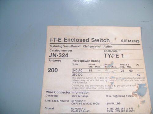ITE 400 AMP 600 Volt A Disconnect Lockout Safety Switch 350HP AC 50HP DC Type 1