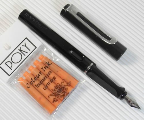 JINHAO 599B Fountain pen BLACK plastic barrel free 5 POKY cartridges ORANGE ink